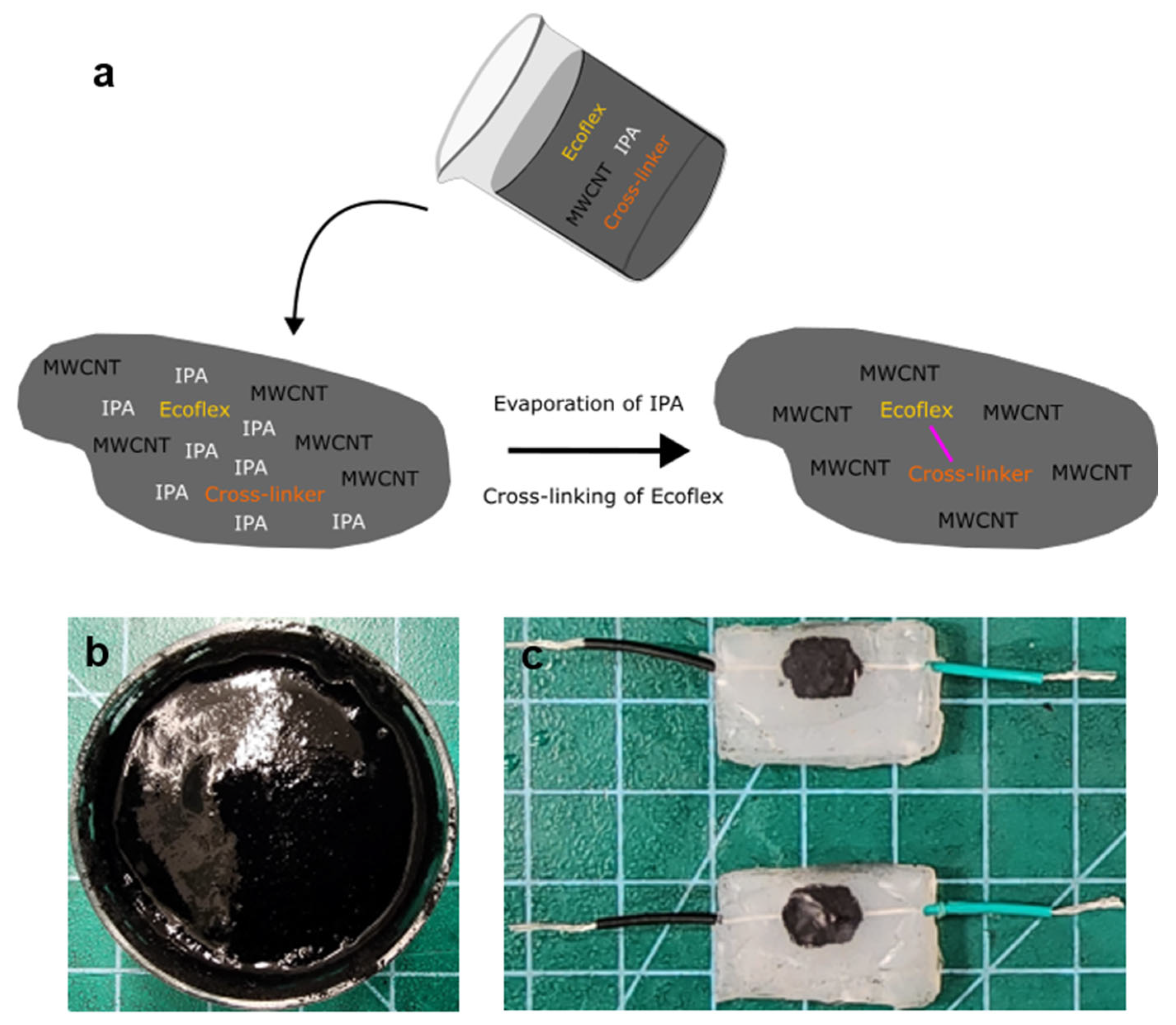 - Du, J.; Wang, L.; Shi, Y.; Zhang, F.; Hu, S.; Liu, P.; Li, A.; Chen, J. Optimized CNT-PDMS Flexible Composite for Attachable Health-Care Device. Sensors 2020, 20, 4523. [Google Scholar] [CrossRef] [PubMed]