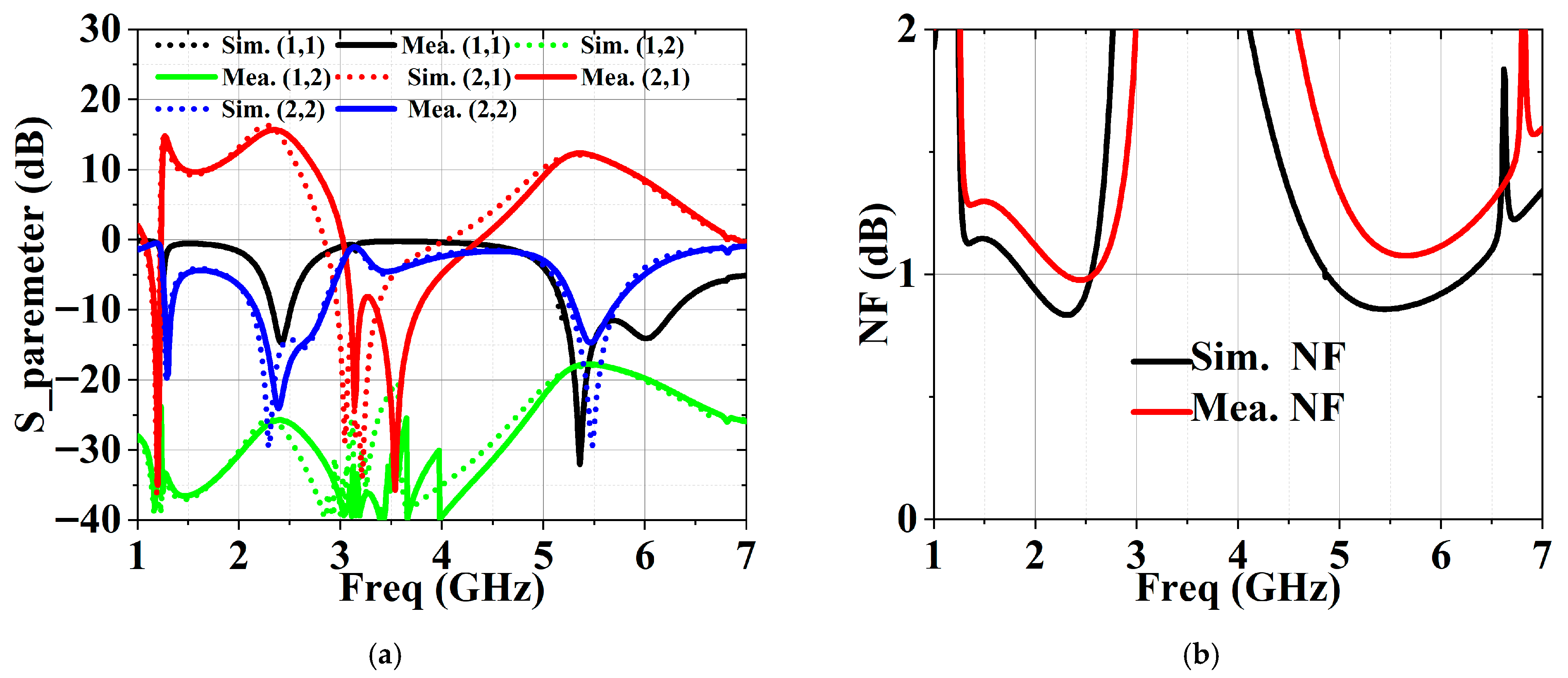 - Hsiao, Y.-C.; Meng, C.; Yang, C. Design Optimization of Single-/Dual-Band FET LNAs Using Noise Transformation Matrix. IEEE Trans. Micro-Wave Theory Tech. 2016, 64, 519–532. [Google Scholar] [CrossRef]