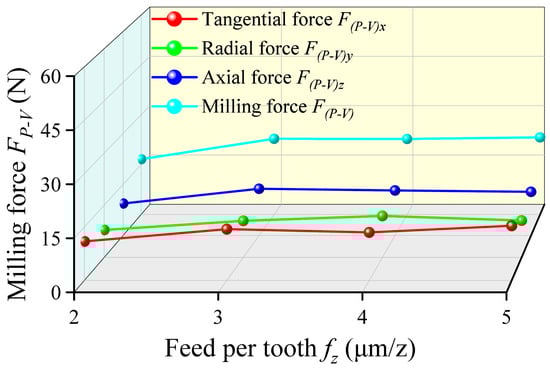 | Milling Depth ap (μm) | Feed Per Tooth fz (μm/z) | Cutting Speed vc (m/min) | Tangential Force F(P-V)x (N) | Radial Force F(P-V)y (N) | Axial Force F(P-V)z (N) | Milling Force F(P-V) (N) | |