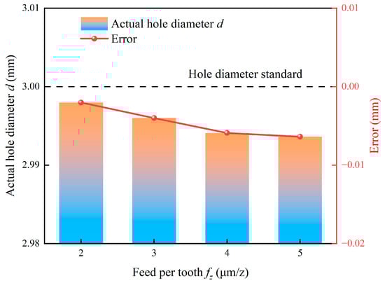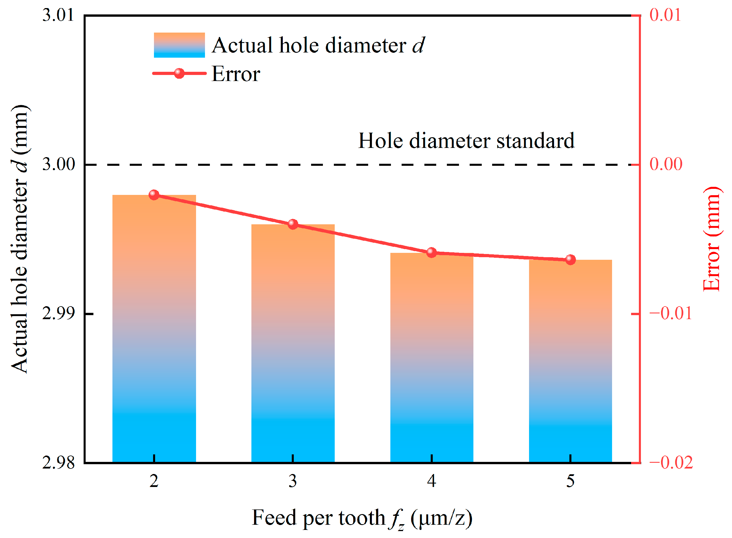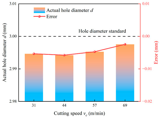 - The geometrical accuracy of holes is primarily determined by the dynamic stability of the machining system, which is heavily influenced by tool deflection and chatter. Larger milling depth and feed per tooth exacerbate tool deflection, leading to undersized holes and degraded form accuracy. The relationship between cutting speed and geometrical errors is characterized by a distinct stability lobe effect. The critical speed of 44 m/min excites system resonance, which causes peak errors. However, higher rotational speeds between 57 m/min and 69 m/min stabilize the machining process and significantly enhance hole quality.