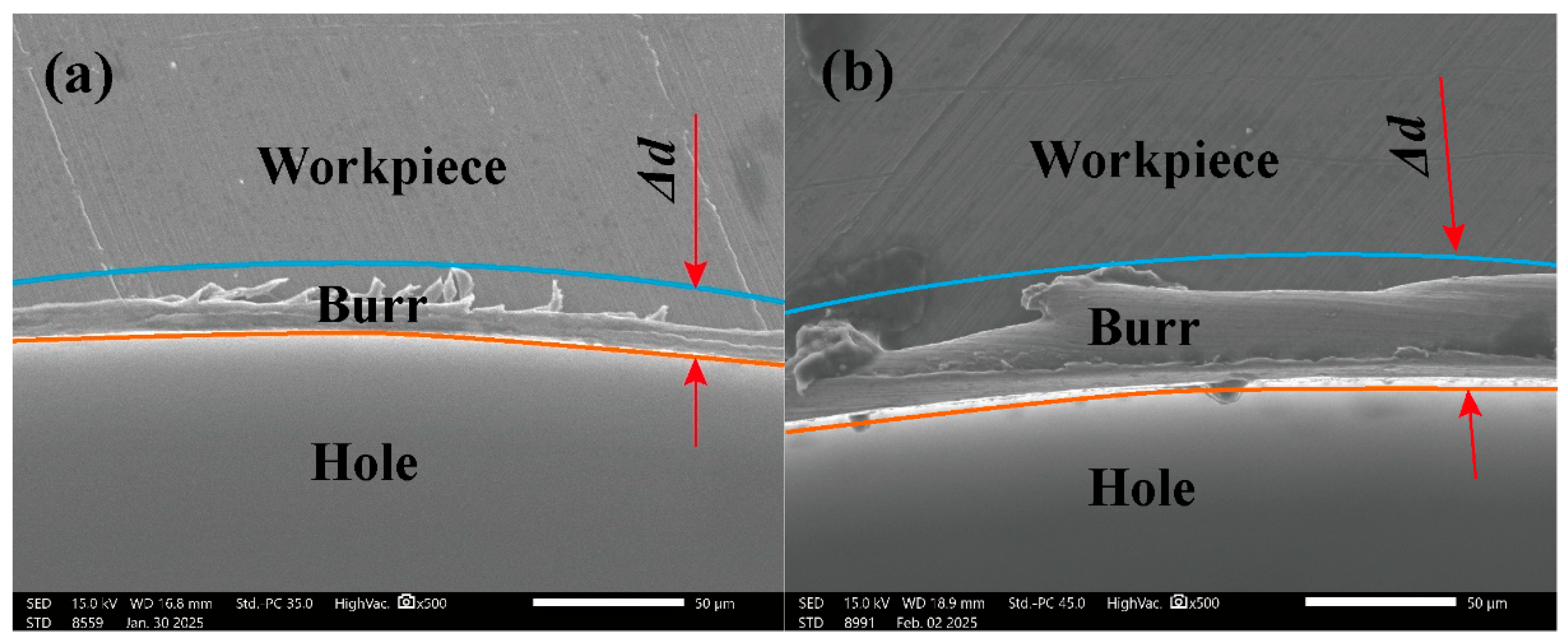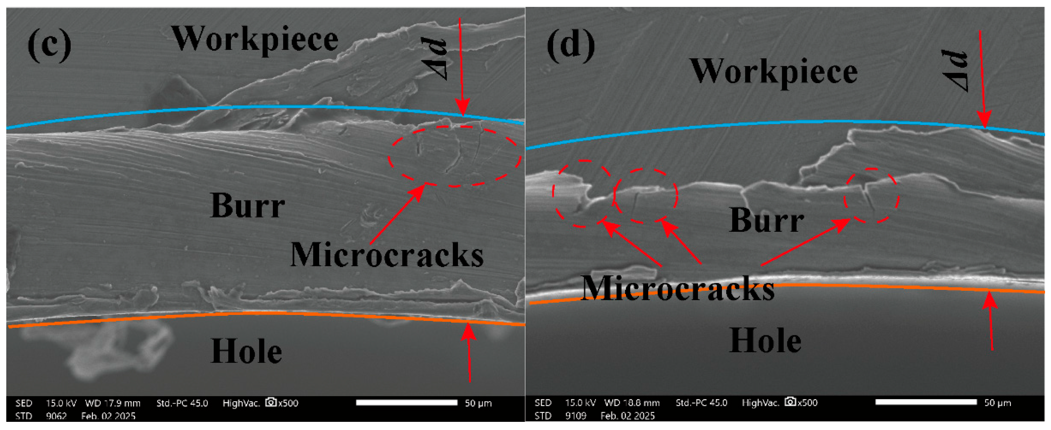 - Burr formation at the hole entrance is critically dependent on the interplay between material plastic flow and the cutting mechanism. Burr width increases with feed per tooth due to the increased volume of plastically flowing material. Conversely, both milling depth and cutting speed exhibit nonlinear relationships with burr size, governed by competing mechanisms. Increasing depth intensifies plastic flow, yet excessive depth may induce fracture. While higher speeds initially promote strain rate hardening, they ultimately suppress burring formation through thermal softening effects and improved material shearing.
