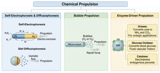 Chemical propulsion microrobots. These systems are categorized into chemically propelled, externally powered, and biohybrid types.