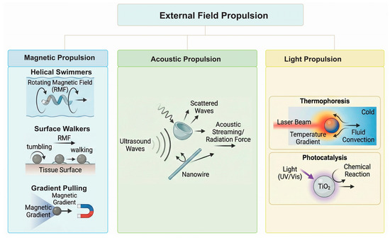 Externally powered robots do not carry their own fuel but are driven by energy fields generated outside the patient’s body [59]. This “fuel-free” operation allows for indefinite operation time and precise external control over velocity and direction [60,61]. Based on the external energy source, these microrobots are categorized as magnetic, acoustic, or light-driven propulsion systems (Figure 2).