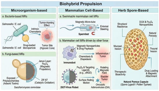Biohybrid propulsion microrobots. These microrobots are categorized as microorganism-based, mammalian cell-based, and herb-based systems.