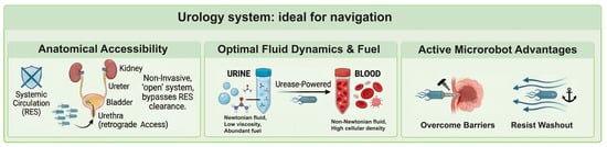 While the potential of medical microrobotics has been explored across various organ systems, the urinary tract presents a unique confluence of anatomical accessibility, fluid dynamics, and metabolic resources that arguably make it the most viable environment for early clinical translation. Unlike the brain or cardiovascular system, which require highly invasive catheterization through the tortuous vascular tree and are guarded by tight endothelial barriers, the urinary tract is an “open” anatomical system. This unique architecture allows for retrograde access via the urethra, enabling the non-invasive deployment of microrobotic swarms directly into the bladder, ureters, or kidneys while completely bypassing the systemic circulation. This approach effectively circumvents the Reticuloendothelial System (RES) clearance that typically sequesters intravenous nanomedicine in the liver and spleen [106]. Once introduced, microrobots encounter a hydrodynamic environment that is ideal for locomotion; urine is a Newtonian fluid with a density of approximately 1 g/cc and dynamic viscosity of 0.01 g/(cm/s) [107]. This is nearly identical to water and stands in stark contrast to blood, which acts as a non-Newtonian, shear-thickening fluid with high cellular density. The absence of hematocrit in urine significantly reduces drag forces and minimizes the risk of bio-fouling or non-specific aggregation, thereby simplifying the low-Reynolds-number physics required for propulsion. Furthermore, the urinary tract provides an indigenous chemical fuel source for autonomous operation: urea. As an abundant metabolic waste product, urea can be harvested by urease-functionalized nanomotors to generate propulsion indefinitely. This offers a distinct safety advantage over glucose-driven motors in the blood, where fuel depletion could be metabolically dangerous. When coupled with the ability to image these agents using standard urological ultrasound and the natural capacity to void the robots after the mission is complete, the urinary tract emerges not just as a target for therapy, but as the perfect physiological playground for the next generation of active biomedical machines (Figure 4).