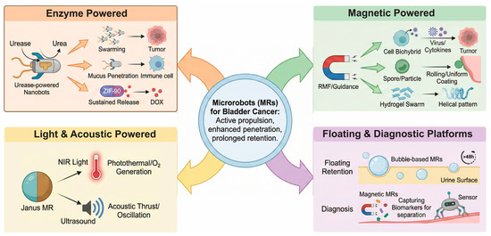 Bladder cancer (BC) management faces significant challenges, primarily due to the high recurrence rates of non-muscle-invasive bladder cancer (NMIBC) and the limited residence time of intravesical therapeutics caused by periodic urination. Microrobots MRs offer a transformative solution by providing active propulsion, enhanced tissue penetration, and prolonged retention within the bladder cavity (Figure 5) [117,118].