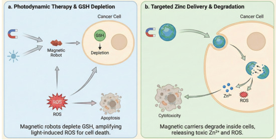 - Ussia, M.; Urso, M.; Kratochvilova, M.; Navratil, J.; Balvan, J.; Mayorga-Martinez, C.C.; Vyskocil, J.; Masarik, M.; Pumera, M. Magnetically driven self-degrading zinc-containing cystine microrobots for treatment of prostate cancer. Small 2023, 19, 2208259. [Google Scholar] [CrossRef] [PubMed]