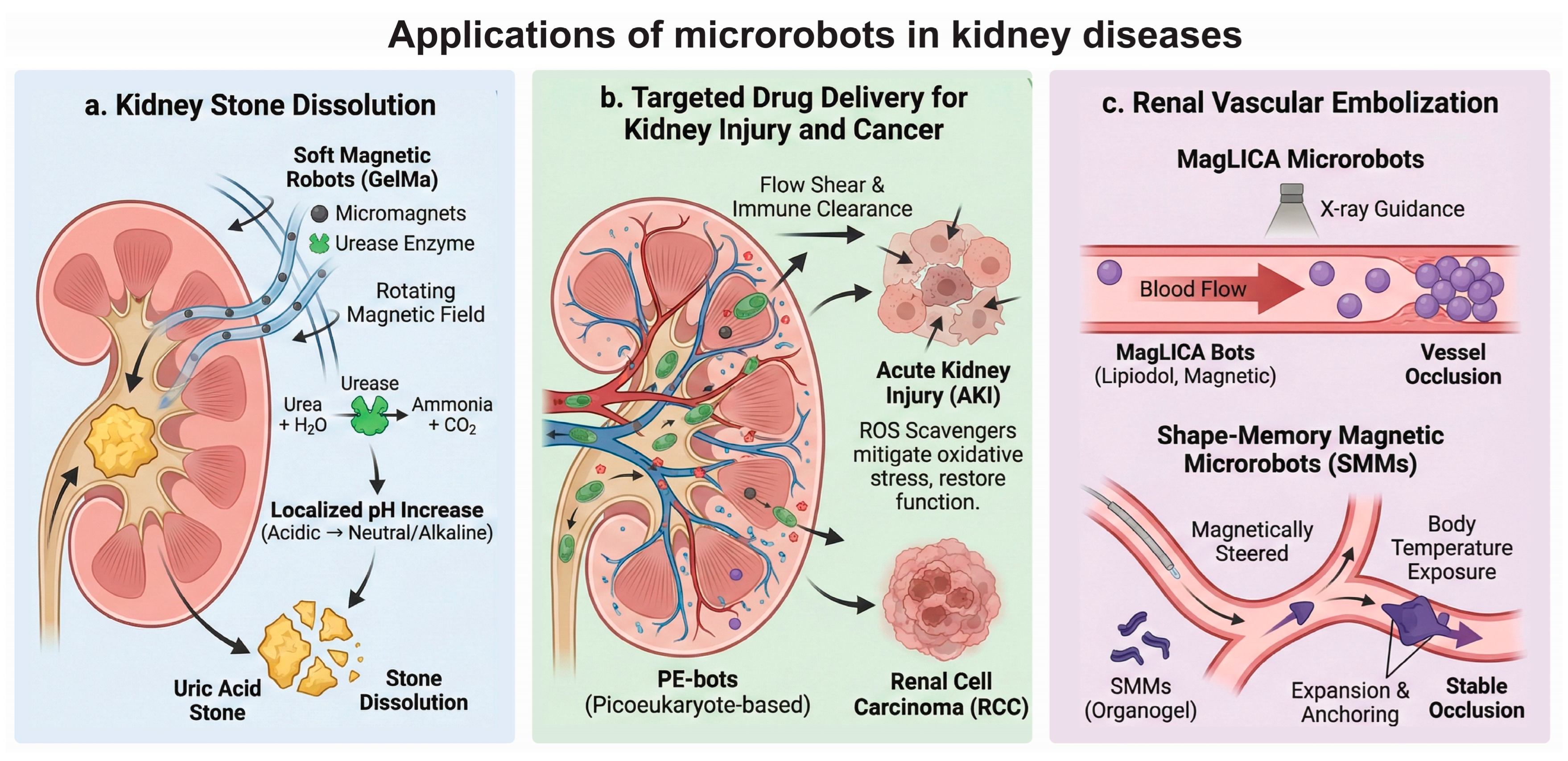 - Khabbazian, A.; Kwong, L.; Lewis, A.; Liu, E.; Abdelrazec, N.; Bakenecker, A.C.; Fontanals, N.; Lopez, G.; Sánchez, S.; Lopez, J.M. Kidney Stone Dissolution By Tetherless, Enzyme-Loaded, Soft Magnetic Miniature Robots. Adv. Healthc. Mater. 2025, 14, 2403423. [Google Scholar] [CrossRef] [PubMed]