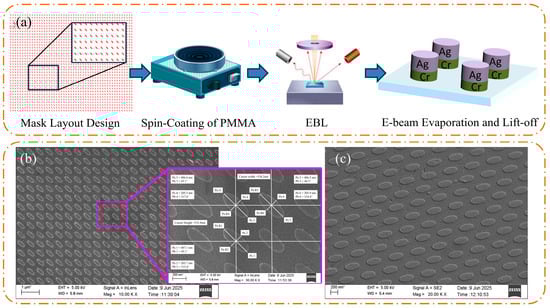 The metasurface structures were fabricated via electron-beam lithography (EBL) and plasma etching. The process began with the design of a .tdb layout file in L-Edit that confirmed to the target specifications. A SiO2 substrate was spin-coated with a thin layer of poly (methyl methacrylate) (PMMA) electron-beam resist and baked at 120 °C for 5 min. The metasurface pattern for the quarter-wave plate was then exposed using a JBX-6300FS EBL system. Following exposure, the sample was developed in a MIBK: IPA (1:3) solution and rinsed in ethanol. A bilayer metal stack—10 nm of chromium as an adhesion layer and 50 nm of silver—was then deposited via electron-beam evaporation. The sample was then cleaned with acetone and ethanol to remove residual resist ensuring a clean surface. This procedure resulted in a Cr/Ag metasurface patterned on a glass substrate with the intended LP&QWP functionality. The overall fabrication workflow and a representative scanning electron microscopy (SEM) image of the fabricated metasurface are presented in Figure 3, confirming the successful realization of the target nanostructures.