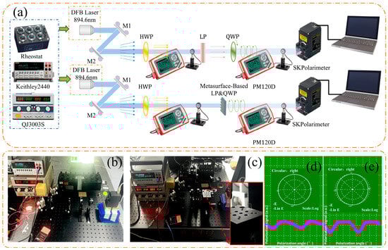 An optical test platform was assembled to evaluate the performance of the metasurface device, all illustrated in Figure 4. The system consisted of a distributed feedback (DFB) laser source operating at 894.6 nm, steering mirrors, a half-wave plate (HWP), a linear polarizer (LP), a conventional quartz quarter-wave plate (QWP), the metasurface-based QWP, a polarization analyzer (SK Polarimeter, Hamburg, Germany), DC power supplies (Keithley 2440, Cleveland, OH, USA and QJ3003S, Ningbo, China), a variable resistor, and an optical power meter (Thorlabs PM120D, Newton, NJ, USA). This setup enabled direct comparison of polarization conversion and optical attenuation between the conventional and metasurface-based LP&QWP configurations. In both cases, linearly polarized light from the DFB laser was converted into circularly polarized light after transmission through the respective LP&QWP assembly.