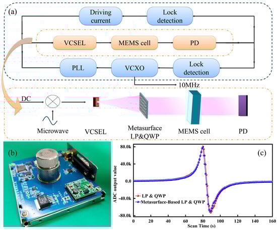A dedicated optical setup was used to evaluate the clock prototype, as shown in Figure 5a. It consisted of a DFB laser, the metasurface LP&QWP, a polarization beam splitter, a MEMS-based atomic vapor cell, a PD, and an oscilloscope. The DFB laser emitted at 894.6 nm, and the light was converted to circular polarization by the metasurface before passing through the vapor cell. The transmitted signal was detected by the PD and recorded on the oscilloscope. Temperature stability of the MEMS atomic vapor cell was maintained using an integrated heater. A photograph of the assembled chip-scale atomic clock prototype is shown in Figure 5b, highlighting the core optical subassembly and surrounding control electronics.