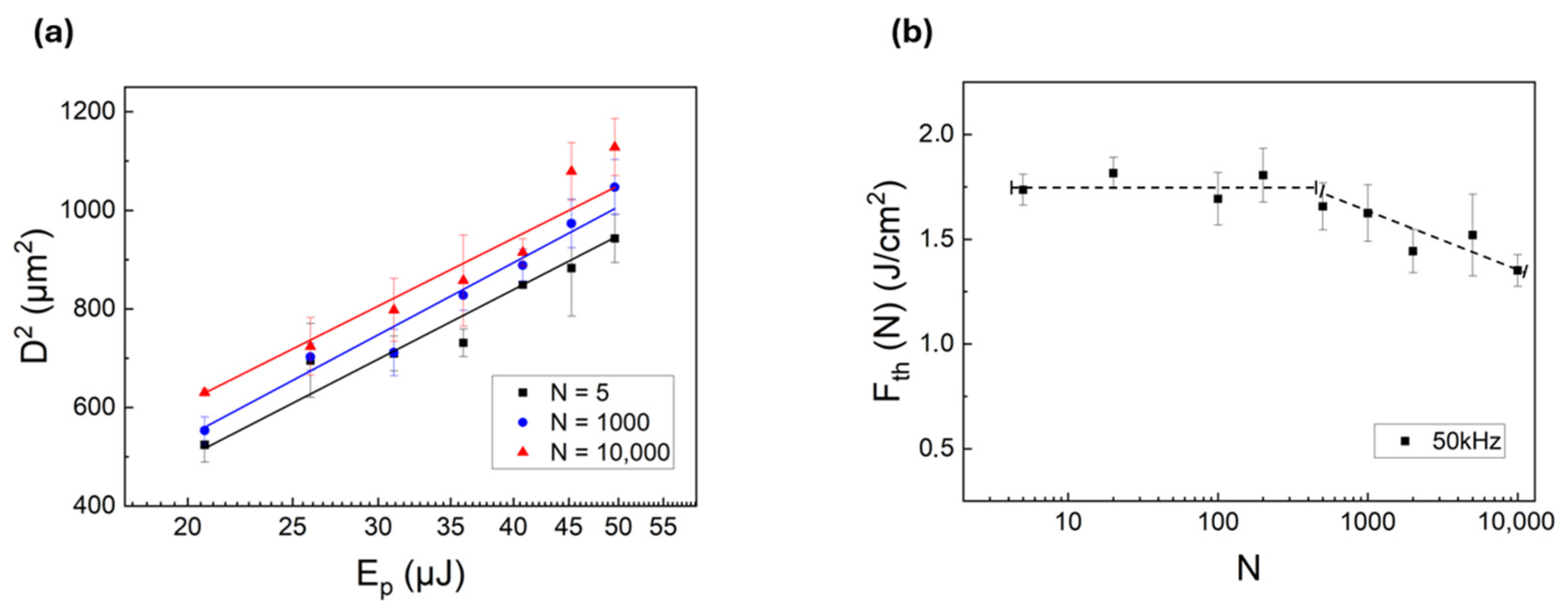 Figure 1a shows the semi-logarithmic graph of the squared crater diameter (D2) as a function of pulse energy (Ep) for different pulse numbers (N) at the highest repetition rate (i.e., 50 kHz). The morphological and optical characterization of the craters was carried out using a Nikon Eclipse ME600 (Nikon Corporation, Tokyo, Japan) optical microscope equipped with ImageJ software (version 1.53k).