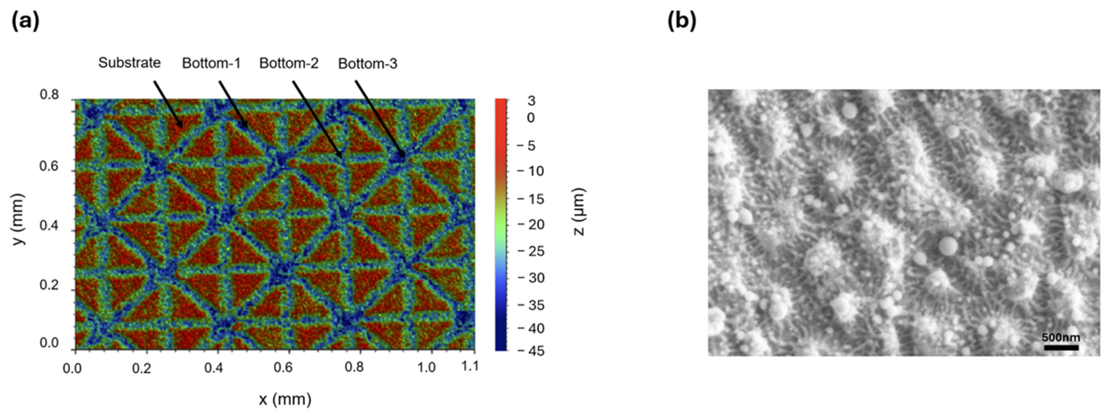 Figure 2. (a) Representative 3D topography of laser-inscribed patterns on Al2O3 surface, featuring a triangular lattice with a texture percentage above 70%. The beam scanning speed was set at 20 mm/s and the depth of the periodic grooves were 17.1 ± 0.1 µm relative to the intact surface. Different regions of the textured surface are highlighted: the unetched substrate (in red), and three areas labeled bottom-1, bottom-2, and bottom-3, corresponding, respectively, to one, two, and four laser passes over the same spot. (b) Sub-micron investigation of the hierarchical morphology by Σigma scanning electron microscopy (SEM) from Zeiss (Oberkochen, Germany).