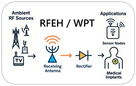 Micro-energy harvesting technologies have recently emerged as promising solutions for reducing or eliminating battery dependence in low-power electronic devices. These technologies convert ambient energy into usable electrical power for applications such as IoT devices, wireless sensor networks, and self-powered electronic systems [1,2,3,4]. Among the various harvesting approaches reported in the literature, radio-frequency energy harvesting (RFEH) has attracted increasing attention due to the growing abundance of ambient communication signals [5,6,7,8] (Figure 1).