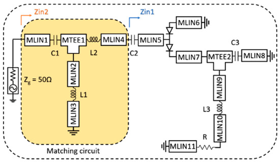 Circuit diagram of the T-type matching network and voltage doubler structure of the wide-band rectifier circuit designed for the verification of the proposed semi-analytical model.