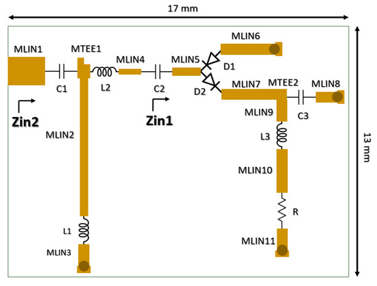 For experimental validation, a compact and wideband RF rectifier prototype was designed and fabricated to compare the calculations of the proposed semi-analytical model with the actual circuit behavior. The prototype consists of a T-type impedance matching network followed by a voltage doubler rectifier configuration. Figure 2 illustrates the circuit topology of the wideband rectifier prototype. The lumped element values and microstrip line dimensions of the fabricated prototype used for experimental validation are summarized in Table 2.
