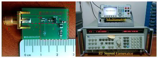 The layout of the proposed wide-band rectifier, its photograph and the devices used during the experiments are shown in Figure 3 and Figure 4. During design and fabrication, an FR4 substrate with a dielectric constant of 4.6, a loss tangent of 0.01, and a thickness of 1.6 mm was used. Broadcom HSMS-2852 Schottky diodes were used in the circuit, and a 1 kΩ resistor was selected as the load. The prototype was manufactured with dimensions of 18 mm × 27 mm, compatible with an SMA connector, and the active circuit area was measured as 13 mm × 17 mm. Measurements were performed using an HP8341A RF signal generator, and an AAtech digital multimeter. The RF input power was swept from −12 dBm to 0 dBm over the 0.5–3 GHz frequency range, and the DC output voltage was recorded for a fixed load resistance of 1 kΩ.