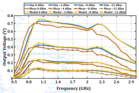 Comparison of measured, simulated, and modeled output voltage (Vout) versus frequency at various input power levels.