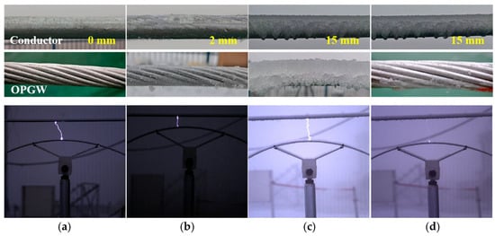 Ice coverage on the conductor–ground wire and corresponding arc images at the maximum discharge distance: (a) no icing; (b) light rime with a thickness of 2 mm; (c) glaze ice with a thickness of 15 mm; (d) glaze ice of 15 mm on the conductor only.