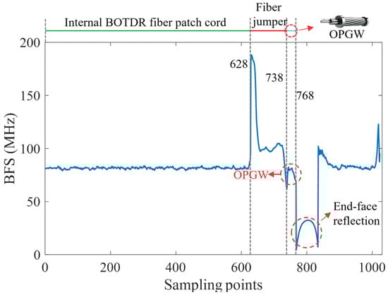 Sampling points 1–628 correspond to the internal fiber patch cord inside the BOTDR, where the BFS remains stable at approximately 80 MHz. Sampling points 629–738 represent the external fiber jumper. A noticeable BFS discontinuity occurs at the splice between the internal and external fibers, after which the BFS stabilizes around 100 MHz. Sampling points 739–768 correspond to the OPGW-embedded sensing fiber. In this region, the BFS shows slight spatial fluctuations due to OPGW structural bending, non-uniform mechanical stress, and the relatively short sample length. Signals recorded beyond sampling point 769 originate from the end-face reflection echo, which exhibits a markedly different amplitude from the preceding Brillouin backscattering signal, allowing clear identification of the fiber termination.
