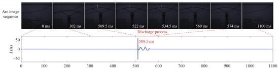 Taking the light rime condition with a maximum discharge distance of dm = 8 cm as an example, Figure 6 shows the typical temporal evolution of the ice-shedding discharge, captured simultaneously through visible arc imaging and discharge current (I) measurement. The moment when the ground wire begins to move is defined as t = 0 ms. As shown in Figure 6, as the gap between the conductor and ground wire gradually decreases and approaches dm, an arc first forms at approximately 509.5 ms, instantly bridging the gap. At that instant, the discharge current transitions rapidly from a weak corona current to a breakdown pulse with a peak value of 60.5 A, then decays within about 0.5 ms into a power-frequency follow current. During the follow current stage, both the arc luminosity and current waveform exhibit periodic variations due to the zero-crossings of the AC voltage. The arc is eventually extinguished following the reclosing operation of the line. The total arc duration is approximately 64 ms, with the significant discharge current persisting for about 50 ms.