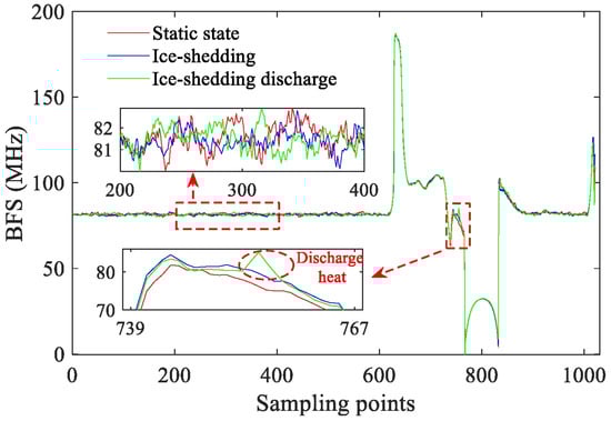 A comparison of the BFS distributions along the optical fiber under three conditions: static, ice-shedding, and ice-shedding discharge.