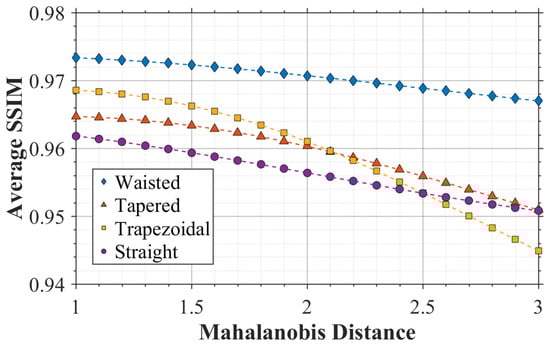 Figure 6 shows the distribution of generalization ability within the untrained parameter space. To quantify the deviation of the testing parameter and the training data, the Mahalanobis distance is introduced as a covariance-aware measure of distribution shift in the joint parameter space. Each sample is represented by the parameter vector , where is the Super-Gaussian exponent; is the beam waist radius; and denotes the hole-type index. Using all training samples , the mean vector and covariance matrix are computed, respectively. The Mahalanobis distance of a test sample is then defined as . Compared with Euclidean distance, accounts for differences in parameter scales and correlations and thus provides a more appropriate indicator of distribution shift. A small value of indicates that the test condition lies within (or close to) the high-density region covered by the training data, whereas a large value of corresponds to the out-of-distribution case. Although all hole types maintain high fidelity, the generalization capability of SD model shows a decaying trend. As the Mahalanobis distance gradually increases, differences among hole types emerge: trapezoidal holes exhibit severe decay, while waist holes maintain optimal robustness. The generalization capabilities of hole type mainly rely on the training data distribution—waist hole samples constitute a larger proportion of the total dataset, leading the model to learn more thoroughly about common hole types that frequently appear in the dataset.