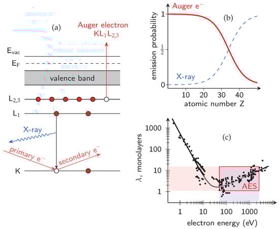 Figure 1. (a) Schematic of K-shell ionization followed by either Auger electron emission from L2,3 shell or X-ray photon emission (EF is the Fermi level, Evac is vacuum level); (b) emission probabilities of Auger electrons and X-rays versus atomic number Z; (c) electron escape depth (inelastic mean free path) versus kinetic energy, plotted using digitized data from Ref. [44].