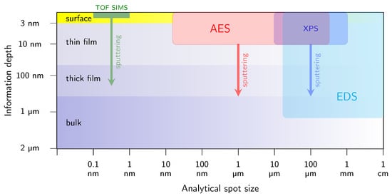 Figure 2. Comparison of selected methods for materials characterization in terms of their information depth and analytical spot size. AES combines the short escape depth of Auger electrons with fine lateral resolution and thus it is suitable for micro-chemical analysis of multilayer semiconductor structures.