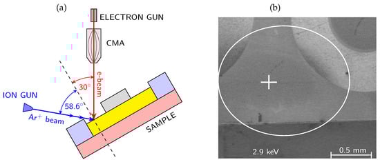 The system was equipped with a Schottky field emission electron gun and full cylindrical mirror analyzer with a coaxial multichannel detector. The energy of the primary electron beam was 10 keV, incident at an angle of 30° with respect to the normal of the analyzed surface. The sample current was kept constant at 20 nA. The depth profiling was performed using a scanning differential Ar+ ion gun operating at a low energy of 500 eV, to minimize atomic intermixing and reduce artifacts induced by ion bombardment. Depending on the sputtered material, the effective sputtering rates determined from the measured layer thicknesses and sputtering times ranged from approximately 0.6 to 1.9 nm/min under these conditions. The only exception was the SiNx-passivated sample, for which a higher ion energy of 2 keV was applied, resulting in an increased sputtering rate of approximately 2.6 nm/min, as discussed separately in the Section 5. The ion beam impinged on the surface at an angle of 58.6° from the normal, Figure 3. The sputtering was carried out over a 1 mm × 1 mm area, while Auger spectra were collected from a much smaller internal region that typically measures several µm2. Owing to the use of a scanning differential ion gun, a flat-bottom sputtered crater was obtained, and all AES spectra were acquired from the central region of the crater, where the sputtering rate is spatially uniform and representative.