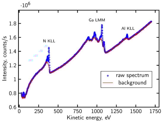 Figure 4. Typical registered direct AES spectrum of passivated AlGaN/GaN structure (blue dots) and theoretically determined background (red line) [47].