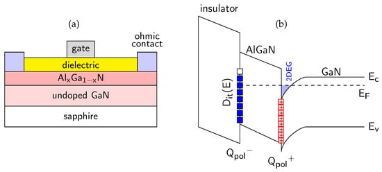 Figure 5. (a) Schematic of dielectric/AlxGa1−xN/GaN device; (b) bandgap diagram of dielectric/AlGaN/GaN structure with marked valence band top (EV), conduction band bottom (EC) and Fermi level (EF). Full squares mean the occupied Dit interface states, including “frozen” states above EF.
