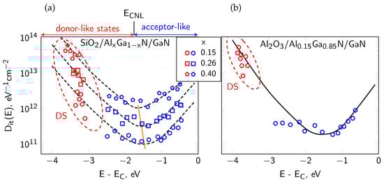 Figure 6. U-shaped energy distribution of the interface state density Dit(E) at the SiO2/AlGaN interface (a) and Al2O3/AlGaN interface. Orange line indicates minima on Dit(E) curves, DS means deep interface states close to Ev; (b) as derived from the electric and photo-electric methods [18]. ECNL means the charge neutrality level between the donor-like and acceptor-like interface states, according to the DIGS model of passivated III/N interfaces, after Refs. [15,18,25].