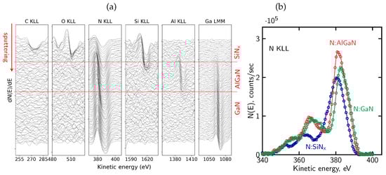Figure 7. (a) Evolution of the differentiated Auger spectra for the main elements present in the SiNx passivated structure—the red horizontal lines denote the interfaces between SiNx, AlGaN, and GaN layers; (b) representative N KLL Auger peak shapes extracted from different regions of the sample (SiNx, AlGaN, and GaN), illustrating distinct lineshapes associated with different bonding environments.