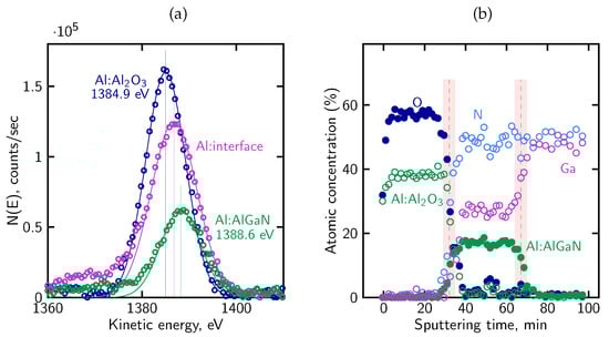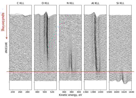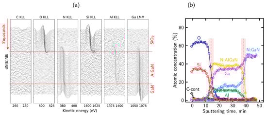The distinct N KLL lineshapes were subsequently used as reference components for the deconvolution of the evolving nitrogen signal using the LLS procedure implemented in MultiPak®, as described in Section 4.2. Based on this lineshape-based deconvolution, the relative contributions of nitrogen associated with the different bonding environments were determined and used to reconstruct the atomic concentration profile shown in Figure 8. The profile reproduces the expected sequence of the SiNx, AlGaN, and GaN layers.