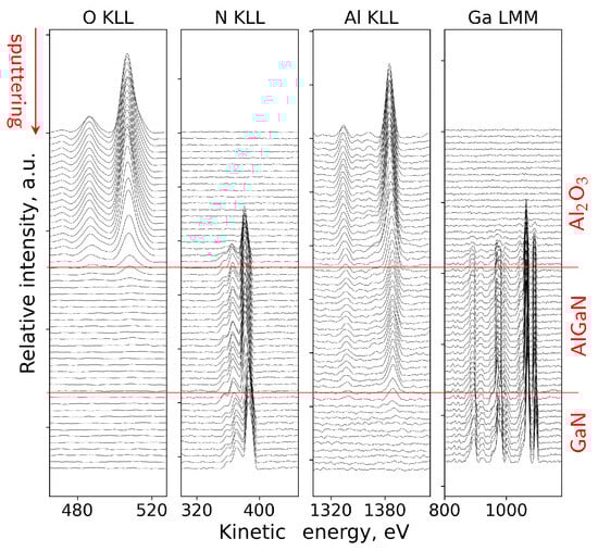 Figure 7b shows representative N KLL Auger peak shapes extracted from different regions of the sample, corresponding to the SiNx, AlGaN, and GaN layers. The spectra clearly differ in their overall lineshape, reflecting distinct nitrogen bonding environments in the dielectric and semiconductor regions. In particular, differences are observed not only in the peak position but also in peak width and the relative intensity distribution within the complex N KLL structure.