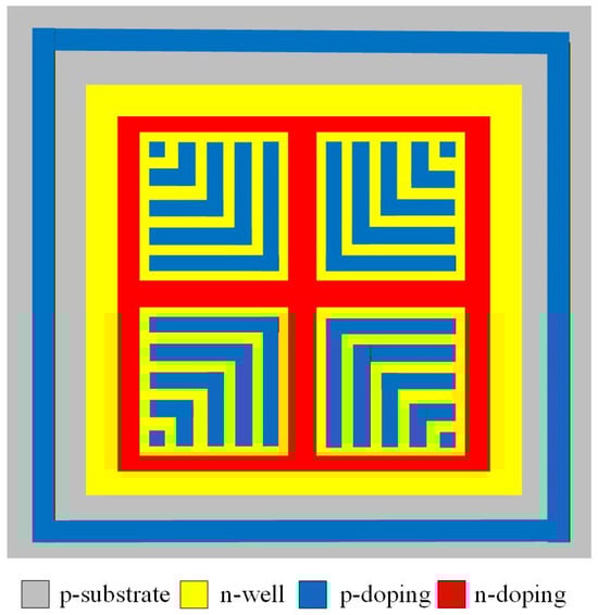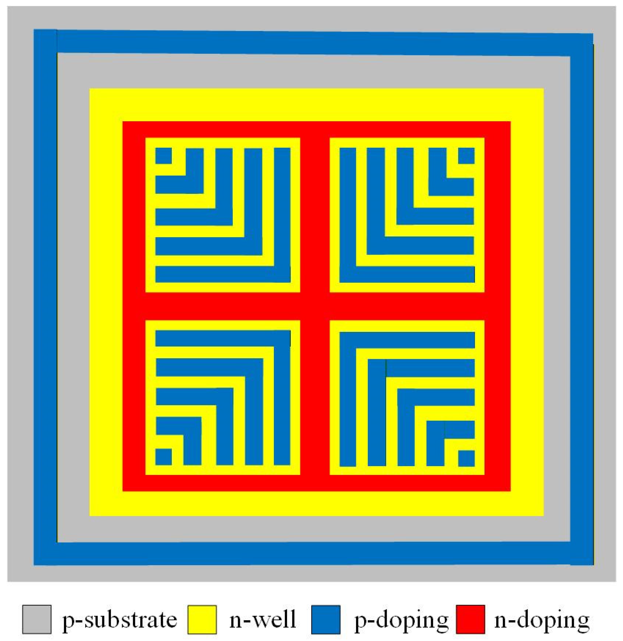 Figure 1 presents the structure of the proposed MPG, revealing how various doped regions are arranged within the silicon substrate to form the device’s active architecture. The structure is created by intentionally introducing multiple doping profiles—p-type regions, moderately doped n-well zones, and heavily doped n-type areas—thus establishing a network of semiconductor junctions that collectively determine the device’s electrical behavior. Unlike traditional photovoltaic layouts that commonly rely on interdigitated finger structures, this study adopts a mesh-like geometric pattern. As shown in Figure 1, a large-area, lightly doped n-well is distributed across the silicon wafer. This lightly doped region is not merely a structural choice; it plays a crucial electronic role. A lower doping concentration helps suppress parasitic leakage paths, reduces junction capacitance, and expands the depletion width, all of which contribute to enhanced carrier collection efficiency. Embedded within this n-well is a patterned array of p-type doped segments arranged in a grid configuration. This mesh configuration increases the available junction perimeter and creates multiple pathways through which photogenerated carriers can separate and travel. The coexistence of two types of p–n junctions—those formed between the patterned p-type mesh and the lightly doped n-well, as well as the junctions at the interface between the p-type substrate and the n-well—results in a more distributed electric field profile. This enhances photon absorption and strengthens carrier extraction across the device. Together, these engineered design choices help boost the microgenerator’s ability to convert incident light into electrical power. The mesh-pattern architecture supports improved uniformity of carrier generation, reduces resistive losses, and maximizes the effective active area. As a result, the MPG achieves superior performance.