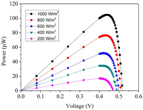 Figure 2 provides the simulated current–voltage characteristics of the microgenerator at different illumination intensities. By applying the simulated voltage and current values to Equation (1), the output power profile as a function of irradiance can be determined. The resulting power curve is illustrated in Figure 3. At low irradiance, such as 200 W/m2, the microgenerator is capable of delivering approximately 14 µW of power, corresponding to a simulated operating point of about 0.42 V. This modest power level is expected, as fewer photons are available to generate charge carriers. When the illumination is raised to 1000 W/m2, the output voltage increases slightly to around 0.45 V, while the current grows substantially due to the higher photon flux. Consequently, the maximum output power reaches approximately 106 µW.