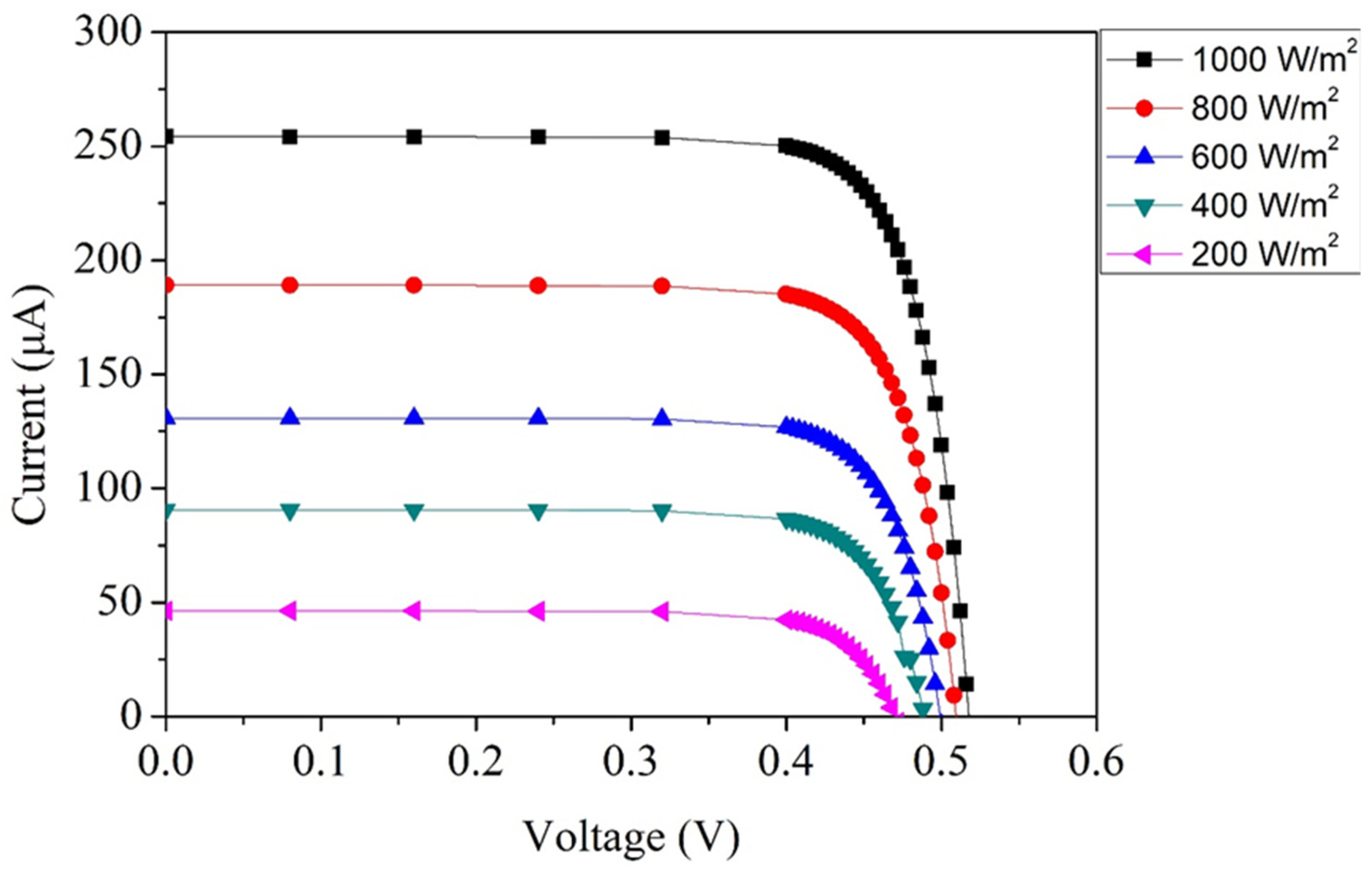 Figure 2 presents the simulated current–voltage (I–V) response of the MPG when subjected to different illumination intensities. In this simulation, the temperature was fixed at 25 °C. The illumination strength was progressively varied from 200 W/m2 to 1000 W/m2 in increments of 200 W/m2, enabling a detailed examination of how photogenerated carrier density changes with incident optical power. At the lowest illumination level of 200 W/m2, the device exhibits an open-circuit voltage (Voc) of approximately 0.47 V, while the short-circuit current reaches about 48 µA. These values reflect the limited number of photons available to generate electron–hole pairs under weak lighting conditions. As the irradiance is increased, both voltage and current rise, though at different rates. When the irradiance reaches 1000 W/m2—five times the initial value—the predicted open-circuit voltage climbs to around 0.52 V, and the short-circuit current increases almost an order of magnitude to roughly 254 µA. This substantial growth in current is expected, as photocurrent is linearly proportional to the photon flux absorbed within the depletion region. The gradual enhancement in open-circuit voltage is comparatively modest because the open-circuit voltage exhibits a logarithmic dependence on photocurrent, whereas the short-circuit current scales nearly linearly with irradiance. This distinction is a fundamental characteristic of photovoltaic devices and is well captured in the simulation results. The observed trends confirm that the microgenerator is highly responsive to changes in optical power and that its internal junction structure efficiently converts additional light into proportionally increased current output.