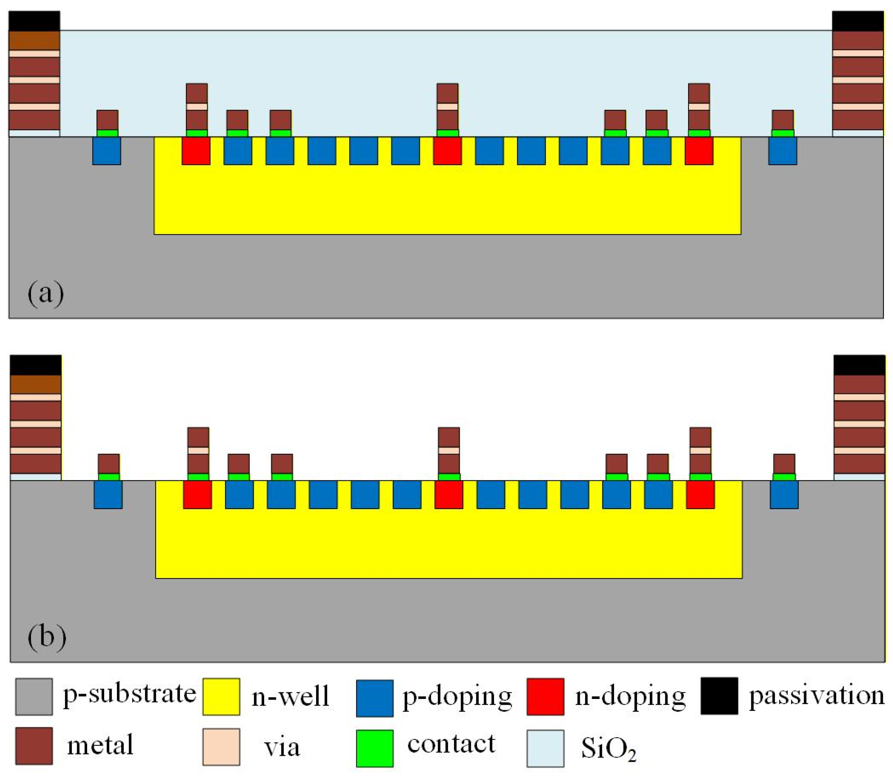 Figure 4a shows the cross-sectional profile of the device immediately after completion of the CMOS process. At this stage, a relatively thick silicon dioxide film covers the p–n junction regions. While beneficial from a protection standpoint, this dielectric layer can inadvertently reduce the amount of light reaching the active junction. Silicon dioxide possesses a refractive index mismatch relative to silicon, which can induce Fresnel reflections, unwanted scattering, and partial absorption—phenomena that diminish the number of photons penetrating into the depletion region. Consequently, the presence of this oxide layer can limit the efficiency of photovoltaic energy conversion. To address these optical losses, a post-CMOS modification was introduced [31]. As depicted in Figure 4b, the silicon dioxide layer above the active regions was selectively removed to expose the p–n junctions directly to incident illumination. The removal was performed using a silox vapox III etchant [32], chosen for its high selectivity and controlled etch rate. This post-processing step provides a clear optical pathway into the semiconductor, significantly enhancing the coupling of incident light into the depletion region. The resulting structure maximizes the absorption of photons and thus improves photocurrent generation, contributing to the higher measured efficiency of the device.