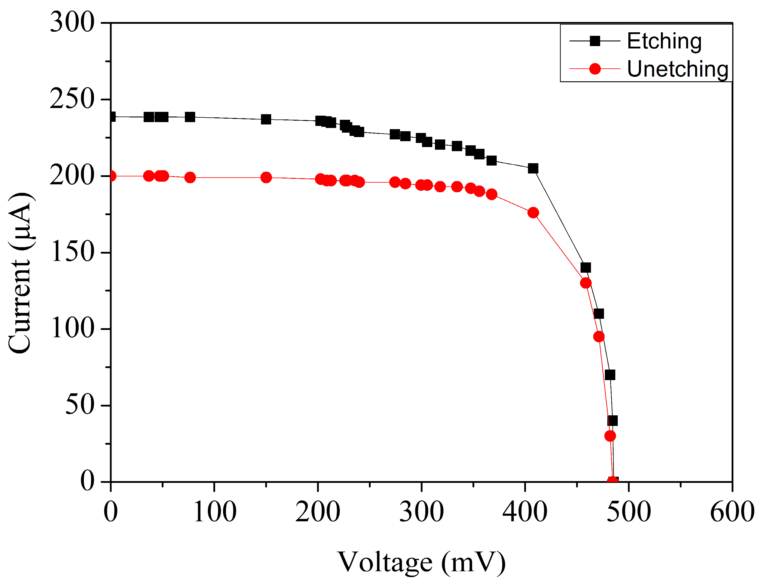 To investigate how post-processing influences device behavior, both versions of the MPG—one retaining the original silicon dioxide passivation layer and the other subjected to oxide removal—were evaluated under identical illumination and temperature conditions. The resulting current–voltage characteristics are presented in Figure 7, where both devices were tested at room temperature under an irradiance of 1000 W/m2.