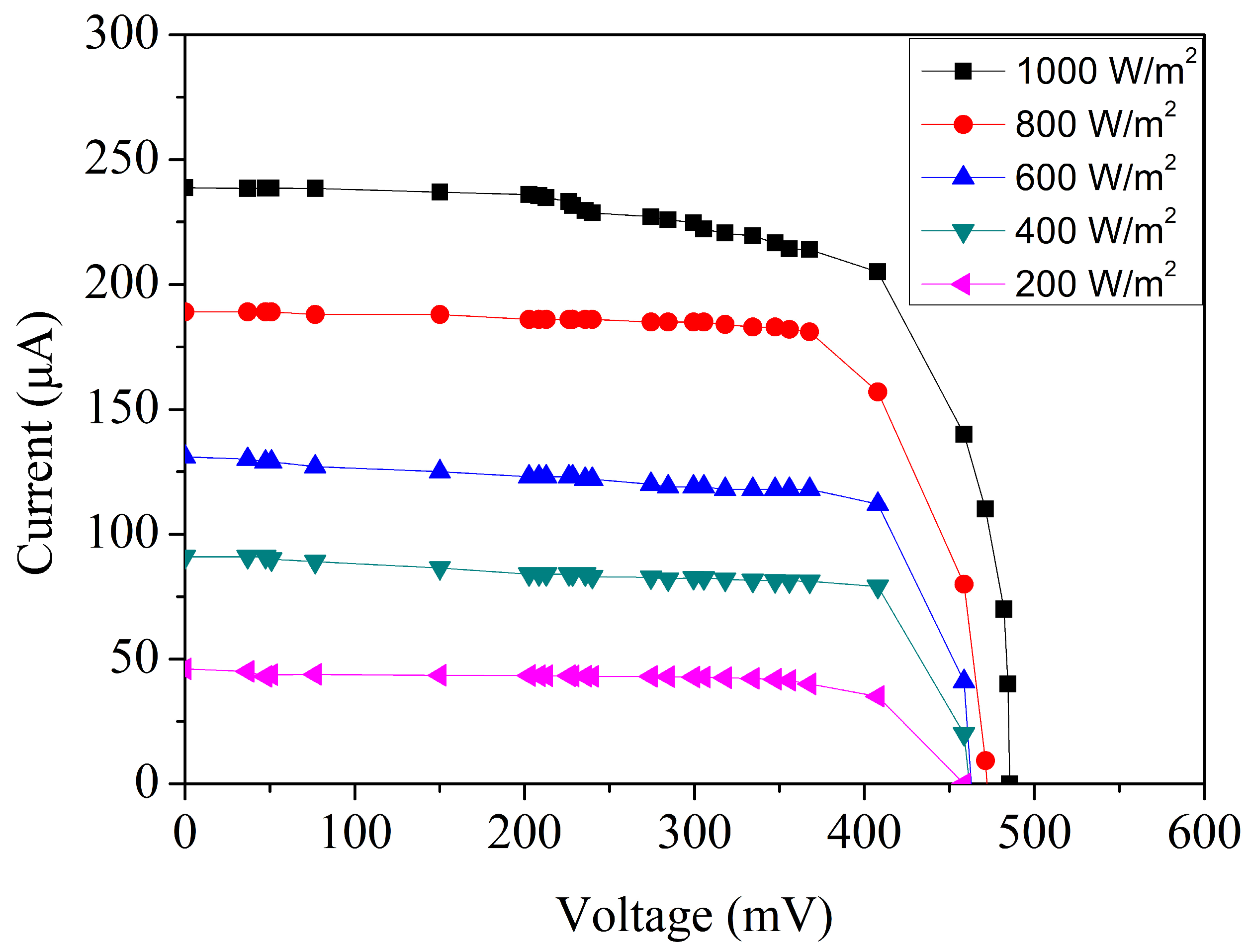 The comparative results shown in Figure 7 clearly demonstrate that removing the silicon dioxide layer significantly enhances the MPG’s electrical output. Because the etched device consistently exhibits superior photocurrent and improved I–V characteristics, all subsequent measurements in this study were performed using the oxide-removed version to ensure that the evaluation reflects the device’s optimal operating condition. Figure 8 presents the measured current–voltage behavior of the microgenerator under a series of controlled irradiance levels. The illumination intensity was incrementally varied from 200 W/m2 to 1000 W/m2 in steps of 200 W/m2, allowing a systematic assessment of the device performance across a broad range of lighting environments. At the lowest irradiance level of 200 W/m2, the device produces an open-circuit voltage of approximately 0.46 V and a short-circuit current of 45 µA. These values correspond to the limited photon flux available under weak lighting and reflect the expected sublinear response in Voc observed in silicon-based photovoltaic devices. As the irradiance increases, a clear upward trend emerges. When the illumination reaches 1000 W/m2, the open-circuit voltage rises to 0.49 V, while the short-circuit current increases substantially to 239 µA. The modest increase in voltage relative to the large increase in current is consistent with semiconductor photovoltaic theory. Because Voc has a logarithmic dependence on photocurrent, it changes only slightly even under large variations in irradiance. In contrast, the short-circuit current is directly proportional to the number of absorbed photons, leading to a nearly linear growth as illumination intensifies.