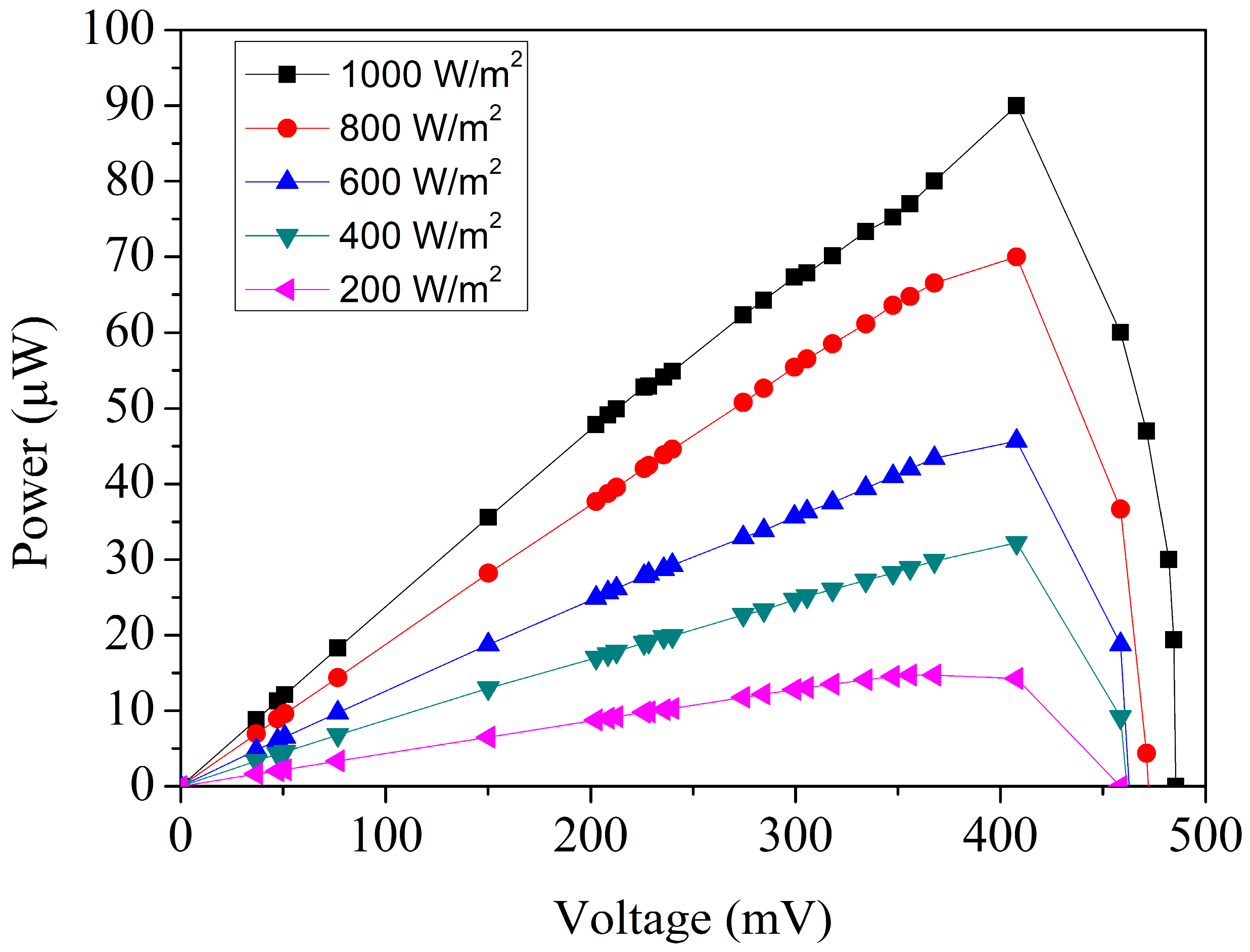 To further evaluate the electrical performance of the MPG, the measured current and voltage values obtained from Figure 8 were substituted into Equation (1) to evaluate the corresponding output power. The resulting power characteristics under different irradiance levels are presented in Figure 9. At an incident power density of 200 W/m2, the device produces a maximum output power of approximately 13 µW, corresponding to an operating voltage of about 0.41 V. This relatively modest power generation is expected because fewer photons are available to create electron–hole pairs under low illumination conditions. Nevertheless, even at this level, the microgenerator generates a measurable and stable output, indicating good sensitivity to low-light environments. As the irradiance is increased, the output power rises significantly. When the illumination reaches 1000 W/m2, the device’s peak operating voltage increases slightly to 0.42 V, while the corresponding power output climbs to roughly 90 µW. At an irradiance of 1000 W/m2, the simulated peak output power is slightly higher than the measured value. This discrepancy can be attributed to several practical non-idealities that are not fully captured in the TCAD simulation. First, optical shading caused by metal interconnects, contact pads, and routing reduces the effective illuminated junction area in the fabricated device, leading to a lower photocurrent than predicted. Second, contact resistance and series resistance, which include metal–silicon contact resistance, sheet resistance in lightly doped regions, and interconnect resistance, degrade the fill factor and thus reduce the extracted maximum power. Third, surface and edge recombination in the fabricated device may be higher than assumed in the simulation due to process-induced defects, interface states, and non-uniformities introduced during post-processing, which further reduce carrier collection efficiency. Finally, the TCAD model employs idealized assumptions such as uniform doping profiles, simplified optical boundary conditions, and perfect interfaces, and it does not account for packaging-related effects such as additional reflection or non-uniform illumination.