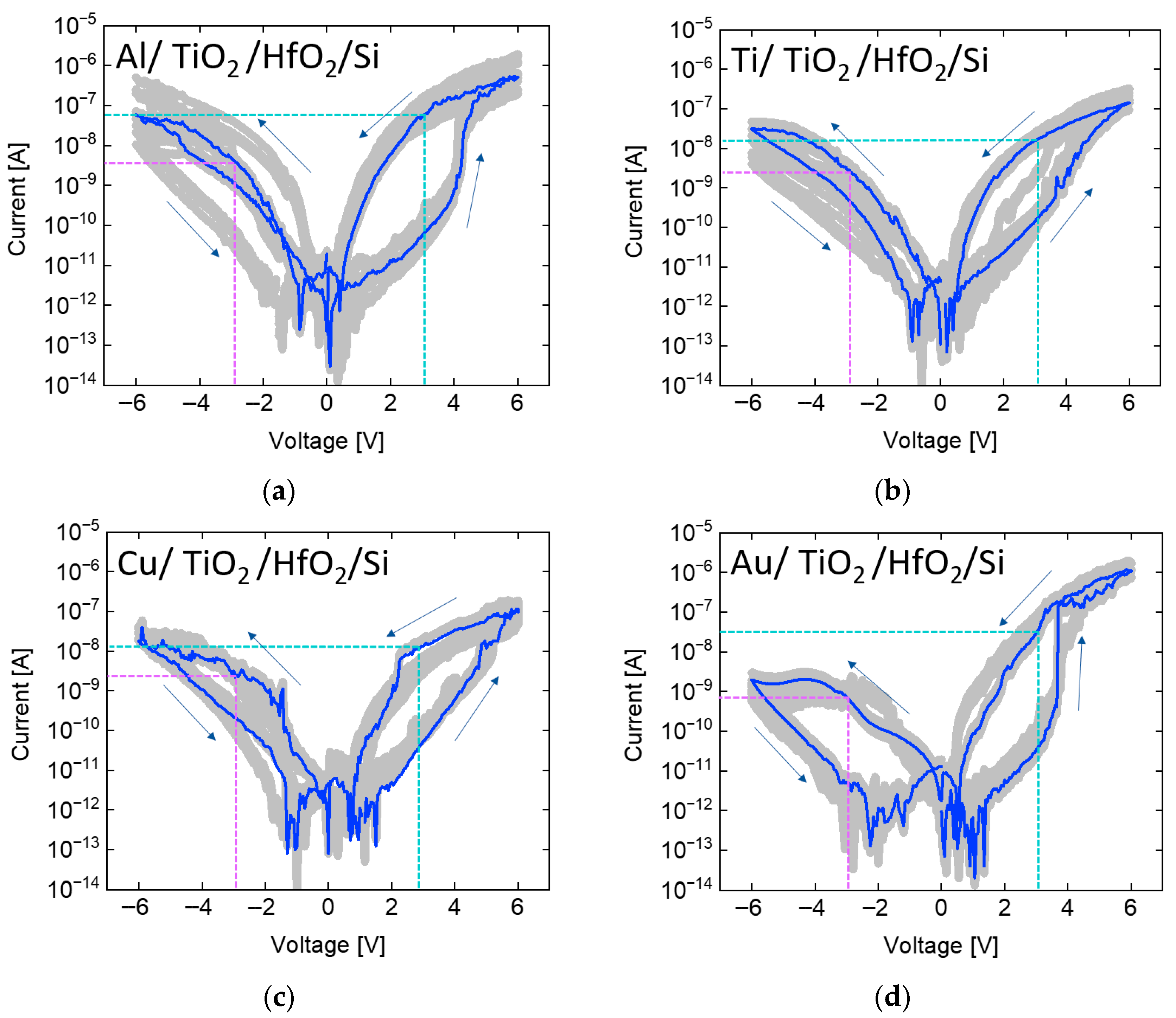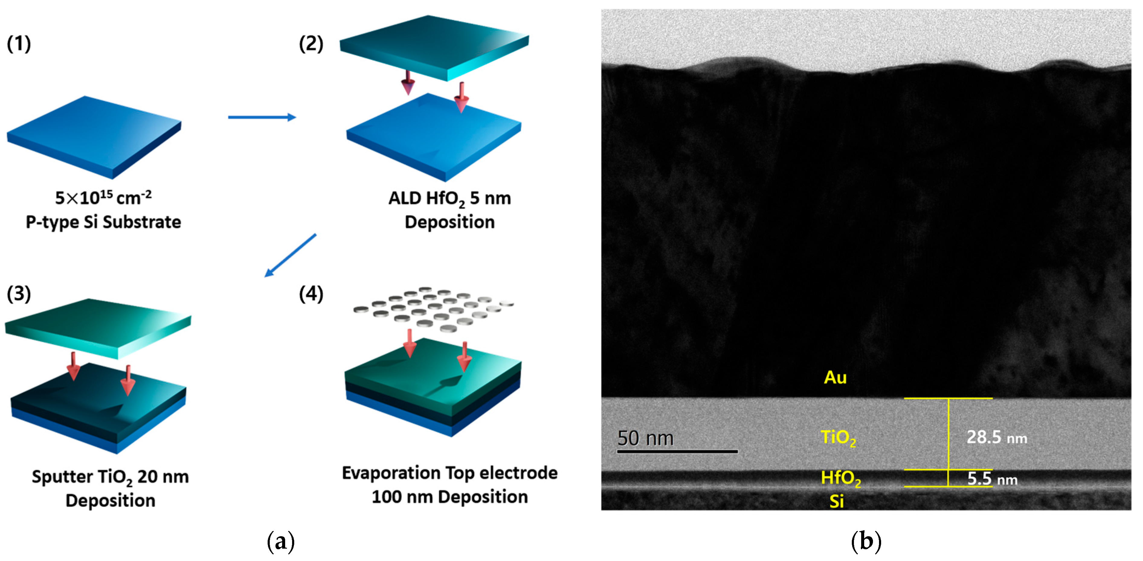 - Hsu, C.-W.; Hou, T.-H.; Chen, M.-C.; Wang, I.-T.; Lo, C.-L. Bipolar Ni/TiO2/HfO2/Ni RRAM with Multilevel States and Self-Rectifying Characteristics. IEEE Electron Device Lett. 2013, 34, 885–887. [Google Scholar] [CrossRef]