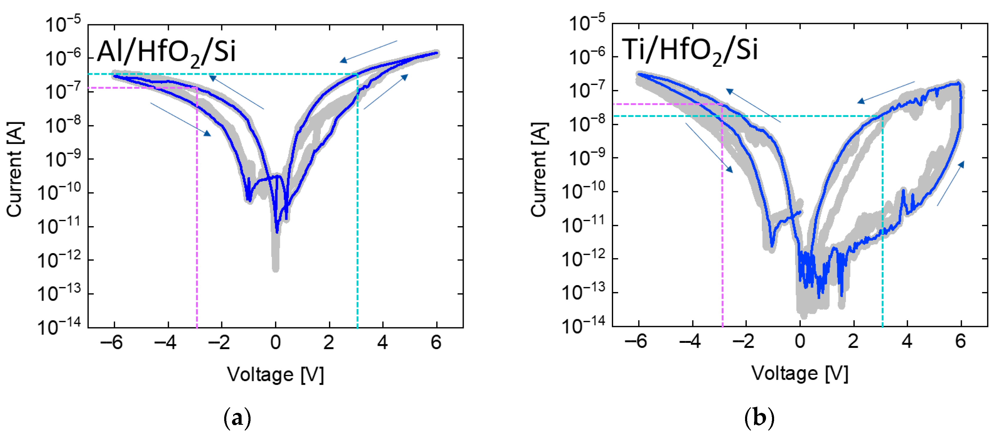 - Yun, M.J.; Lee, D.; Kim, S.; Wenger, C.; Kim, H.-D. A Nonlinear Resistive Switching Behaviors of Ni/HfO2/TiN Memory Structures for Self-Rectifying Resistive Switching Memory. Mater. Charact. 2021, 182, 111578. [Google Scholar] [CrossRef]