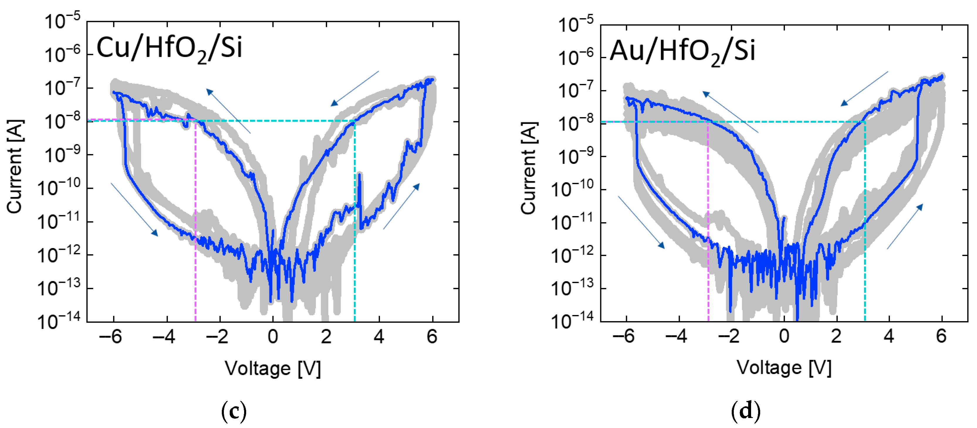 - Lim, J.; Baek, M.-H.; Kwon, M.-W. Analysis of the Switching Mechanism of Hafnium Oxide Layer with Nanoporous Structure by RF Sputtering. J. Semicond. Technol. Sci. 2025, 25, 9–13. [Google Scholar] [CrossRef]