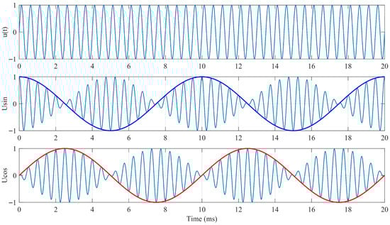 A sinusoidal excitation signal with an amplitude of 5 V and a frequency of 2 kHz is applied to the continuous winding. The voltage transfer coefficient Ku is set to 1, and the rotational speed is configured as 50°/s. The excitation signal and the two induced phase signals are shown in the following Figure 3, where the blue and red envelopes correspond to the position-dependent components sinθ and cosθ, respectively.