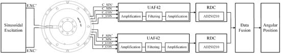 The angular measurement method adopted in this study is the tracking feedback approach, and its overall structure is shown in the following Figure 5. Functionally, the system can be divided into four main circuits: the excitation signal power amplifier, the induced signal filtering and amplification circuit, the resolver-to-digital conversion circuit, and the controller-to-host communication circuit. The controller configures the RDC chip to generate a fixed-frequency sinusoidal excitation signal, which is amplified by the power amplifier and applied to the round inductosyn. The excited inductosyn produces millivolt-level sine and cosine signals, which are then processed through two stages of amplification and band-pass filtering before being sent to the RDC demodulation chip. After demodulation, the chip transmits the calculated position value to the controller via the SPI communication protocol. The controller performs data fusion and subsequently transfers the angular position to the host computer through serial communication.