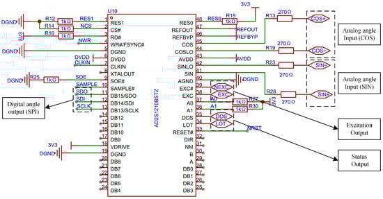 In this design, as shown in Figure 8, the selected RDC chip is the AD2S1210 from Texas Instruments (Analog Devices, Norwood, MA, USA). Two chips share a common crystal oscillator, and equal-length, equal-width PCB routing is employed to ensure clock synchronization and minimize phase deviation in the induced signals [26]. The oscillator operates at a frequency of 8.192 MHz, corresponding to an ideal excitation frequency of 10 kHz. The DOS and LOT pins are used for fault detection: when the sine and cosine signals exhibit amplitude mismatch or exceed a defined threshold, the DOS pin outputs a low-level signal; when the internal error of the AD2S1210 surpasses a specified angular threshold, resulting in loss of tracking, the LOT pin outputs a low-level signal. Accordingly, both DOS and LOT pins are connected to external LED indicators to visually indicate system faults. SPI communication is adopted between the AD2S1210 and the control module. As a result, the parallel data pins DB0–DB15 are left unconnected, while the multiplexed pins associated with SPI communication are connected to the microprocessor of the control module for configuration and data exchange.