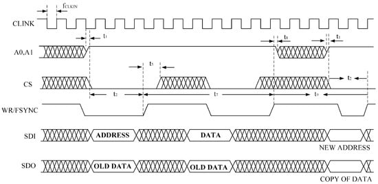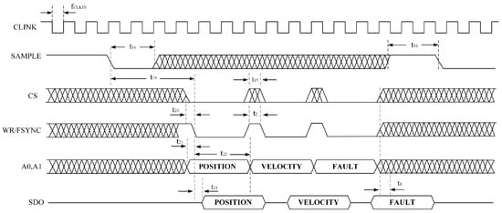 The serial interface of the AD2S1210 consists of four signals: SDO, SDI, WR/FSYNC, and SCLK. The SDI line transfers data to the internal registers, while the SDO line outputs data from them. SCLK serves as the serial clock input, and WR/FSYNC provides frame synchronization. The serial interface does not require a chip-select CS signal; it remains at a low logic level during operation. However, to separately read the coarse and fine channel data of the round inductosyn, the CS pin is used to control whether the chip outputs data to the main controller. The simulated SPI serial communication timing is shown in Figure 10.